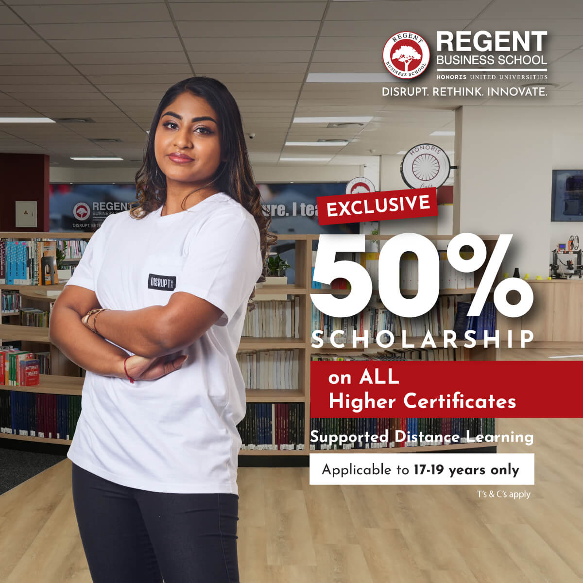 • The 50% scholarship refers to a 50% discount on the programme fee as per Regent Business School’s 2026 Fee Schedule. No additional costs, such as study materials, are covered.